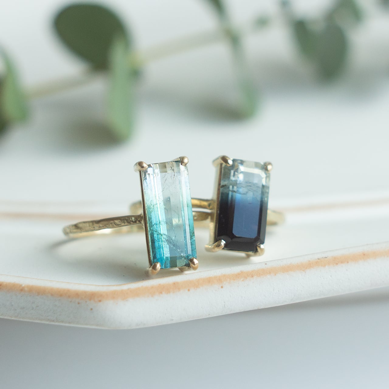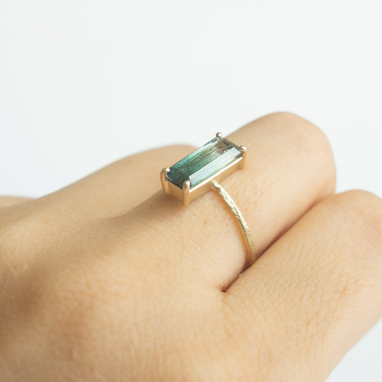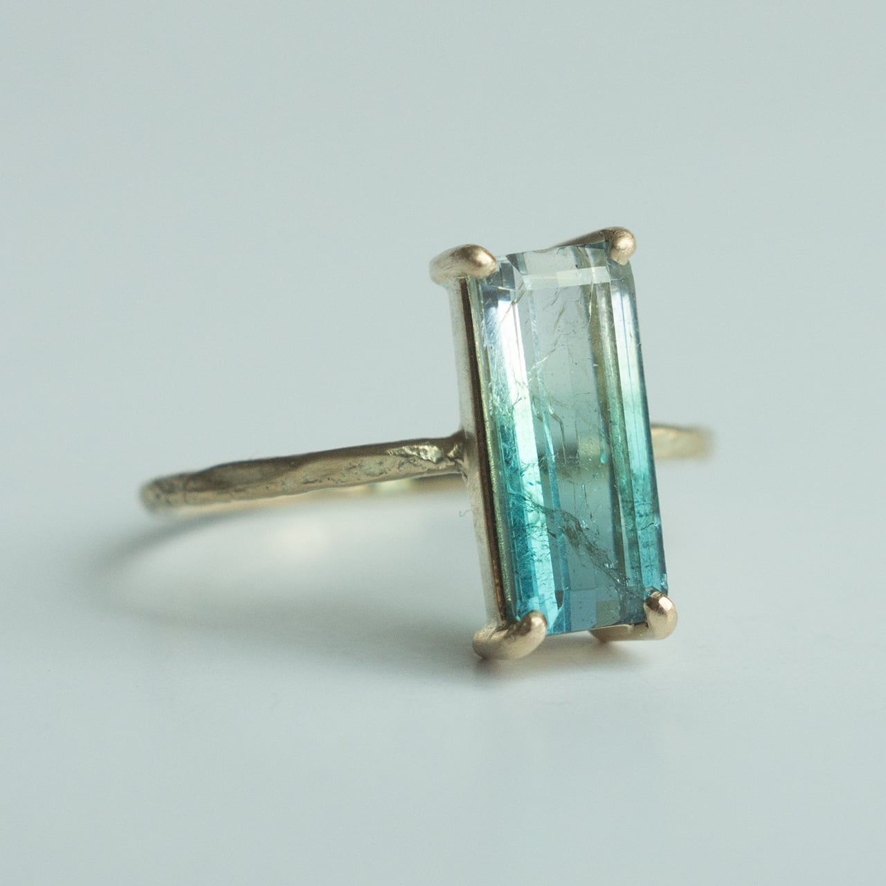 縦長のバゲットカットの結晶の中に、深いブルーグリーンからごく淡いミストグリーンへと色が溶け合うように広がり、透明感のあるグラデーションが静かに流れ込むように感じられる一石です。