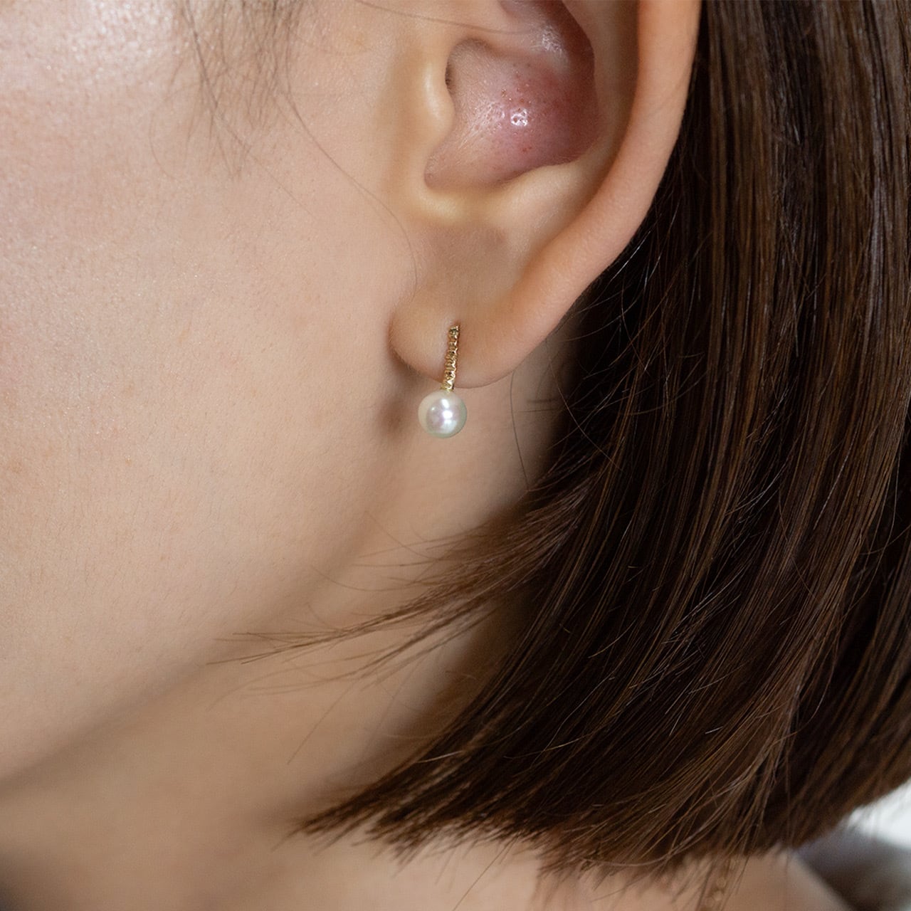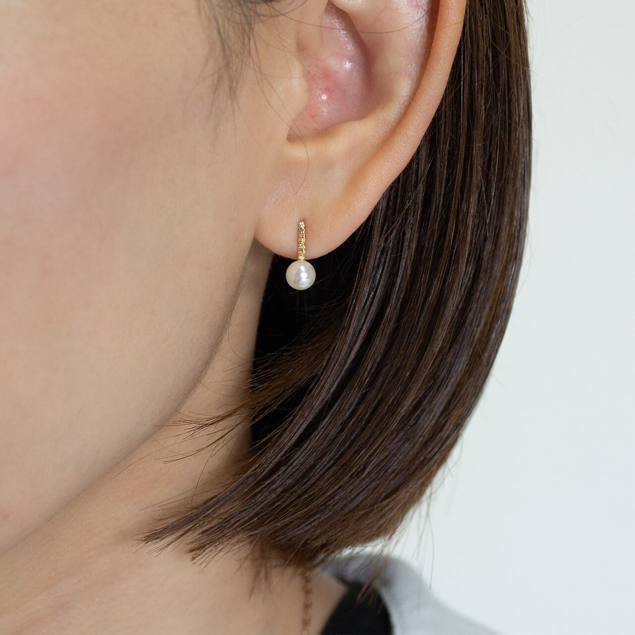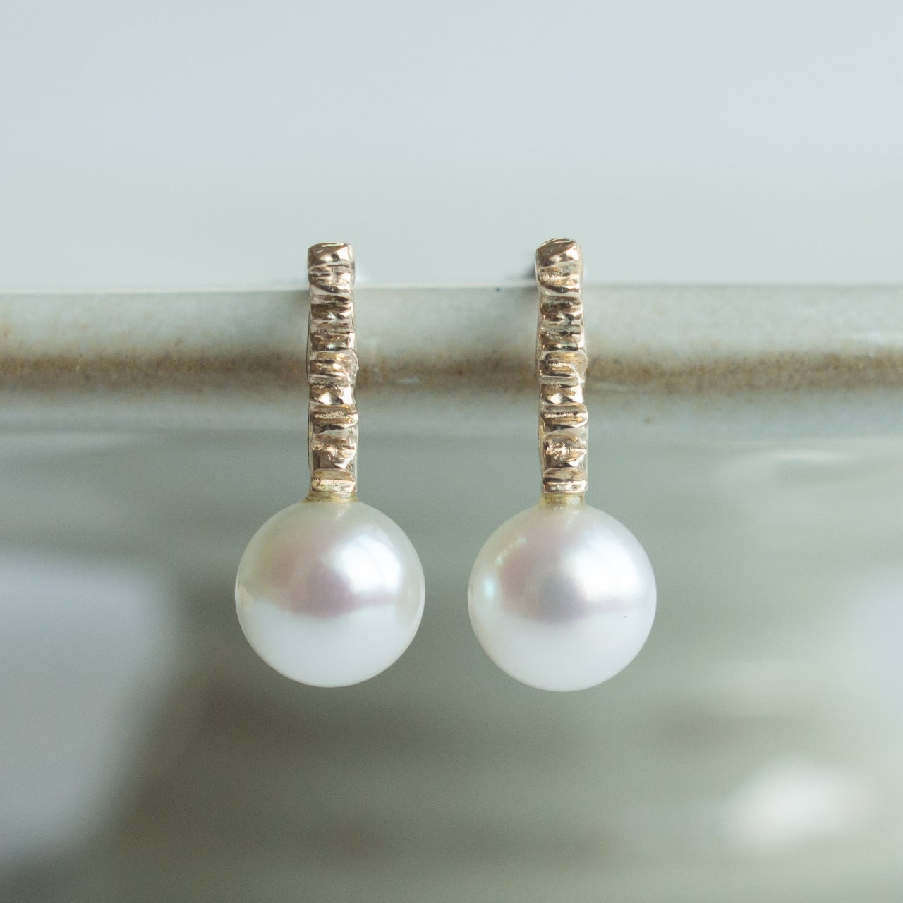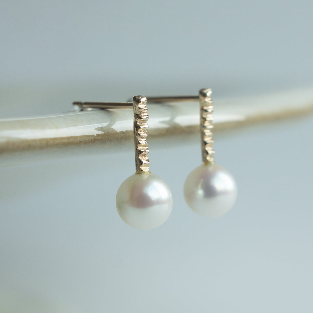 繊細なテクスチャーを施したK10の地金に、あこや真珠を合わせたピアス。